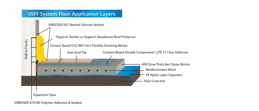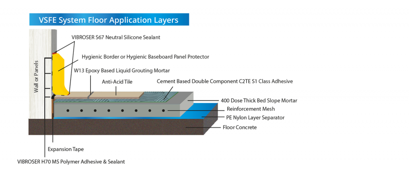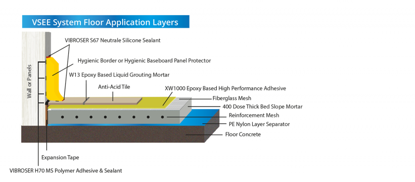 VSEE, özellikle yüksek mekanik mukavemet gerektiren tesisatlar için vazgeçilmez bir çözümdür. Her türlü gıda, et, süt, balık, içecek ve unlu mamul üreticilerinin sıcak ve soğuk odalarının, asidik ve kostik ortamlarının sağlam ve uzun ömürlü zemin ihtiyacını çözer. Ustaların aynı gün içerisinde 400 doz m3 400 kg çimentolu kalın yatak harcı ve seramik uygulaması yaptığı ve zamandan tasarruf ettiği bir sistemdir."